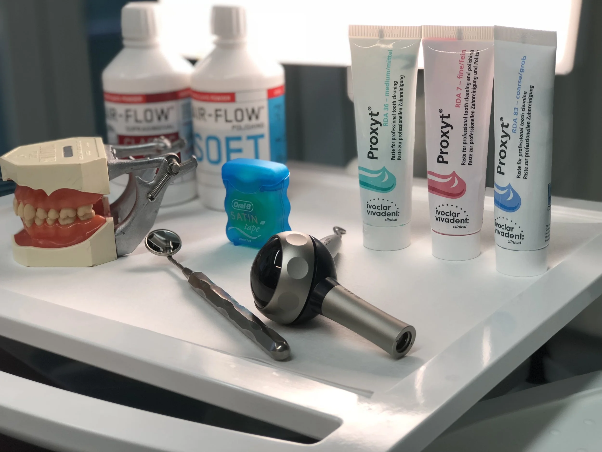 Im Rahmen einer professionellen Zahnreinigung (PZR) werden die Zähne intensiv gereinigt. Hartnäckige Beläge bzw. Zahnstein werden entfernt, dann erfolgt die Reinigung mit einem Pulver/Wasserstrahl-Gemisch (Airflow).